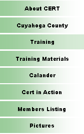 What is covered in CERT Training The Community Emergency Response Team (CERT) Program educates people about disaster preparedness for hazards that may impact their area and trains them in basic disaster response skills, such as fire safty, light search and rescue, Team organization, and disaster medical operation. Using the training learned in the classroom and during exercises. CERT members can assist others in their neighborhood or workplace following an event when professional responders are not immediately available to help. CERT members also encouraged to support emergency response agencies by taking a more active role in emergency preparedness in their community. The CERT training for the community groups is usually delivered in 2 hour sessions, one evening a week for a 9 week period. The training consists of the following: Session I, Disaster Preparedness Session II, Disaster Fire Suppression Session III, Disaster Medical Operations Part l Session IV, Disaster Medical Operation Part II Session v, Light Search and Rescue Operation Session VI, CERT Organization Session VII, Disaster Psychology and team Organization Session VIII, Terrorism and CERT Session IX, Course Review and Disaster Simulation